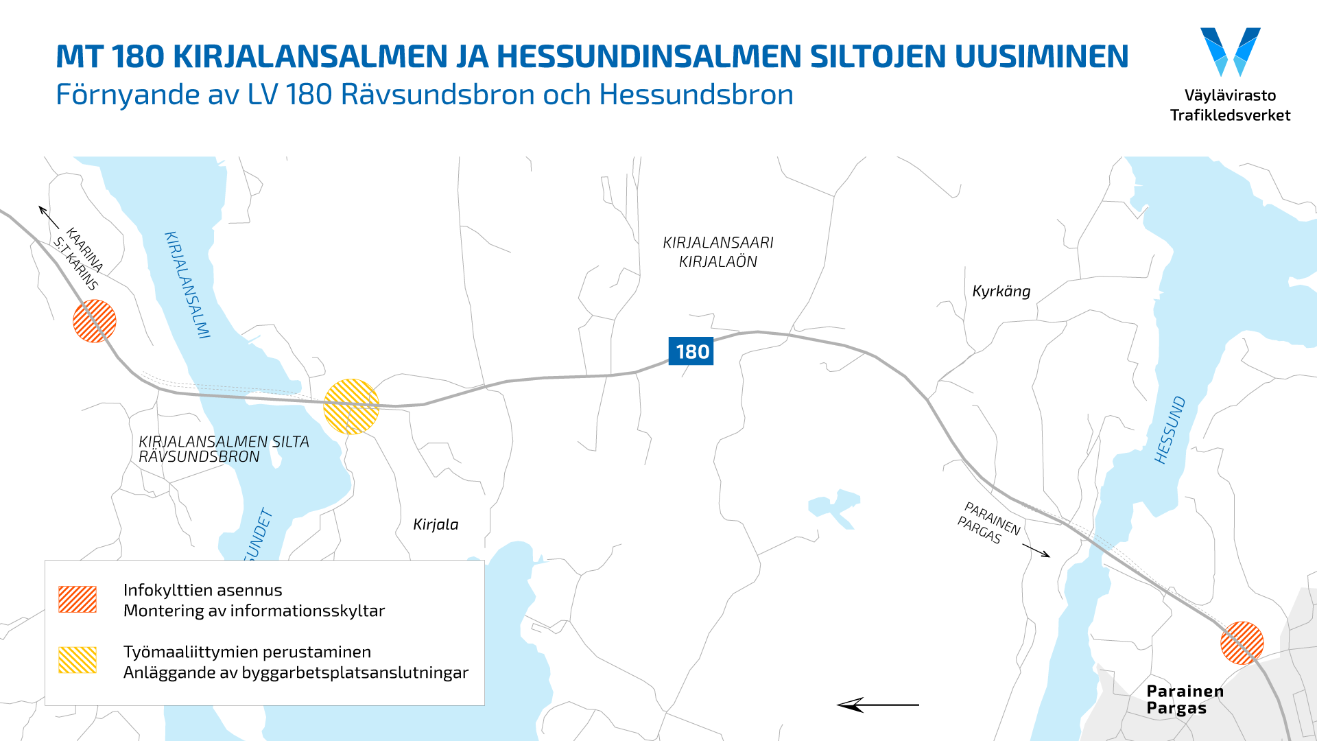 Målet för projektet Lv 180 Förnyande av Rävsundsbron och Hessundsbron är att trygga att den enda landsvägsförbindelsen till Pargas och Åbolands skärgård bevaras och blir bättre än tidigare. Dessutom möjliggörs högkapacitetstransporter, som är betydande för den nationella industrin, till området. Projektet stöder också utvecklingen av näringslivet och markanvändningen i Pargas samt främjar trafiksäkerheten och boendetrivseln. Kostnadskalkylen för projekthelheten är 128 miljoner euro.