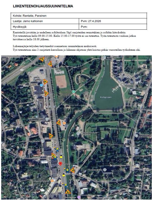 Rantatiellä suoritetaan suojateiden kohdilla asfaltointitöitä keskiviikkona 29.4.2026 klo 9.00–15.00. Tarvittaessa työt voivat jatkua klo 18.00 jälkeen. Työt valmistuvat saman päivän aikana.