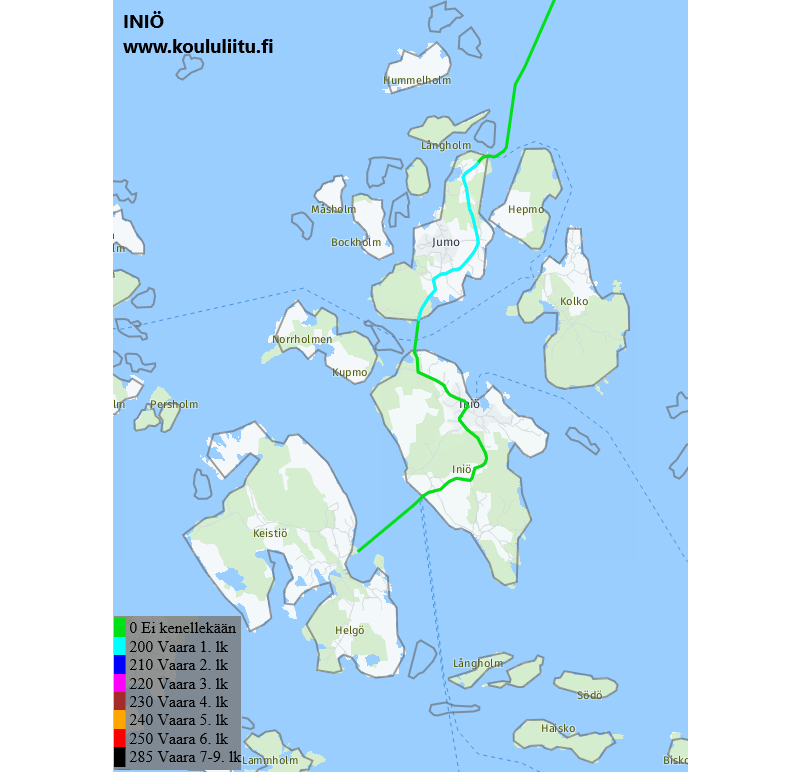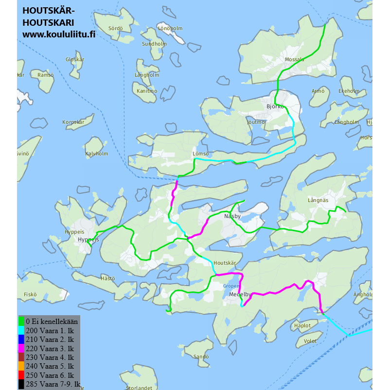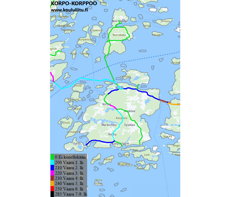 Arvioitaessa kouluteiden vaarallisuutta apuna käytetään Koululiituohjelmaa. Katso lisätietoa koulukuljetusperiaatteista. Karttaliitteet ovat päivitetty 2.4.2019: Parainen, Nauvo, Korppoo, Houtskari, Iniö